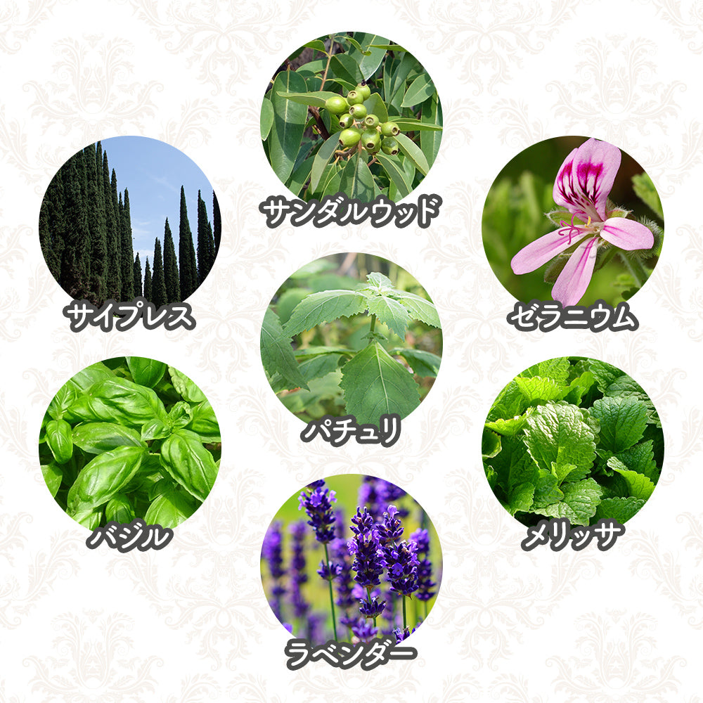 サイプレス、バジル、メリッサ、サンダルウッド、ゼラニウム、ラベンダー、パチュリ