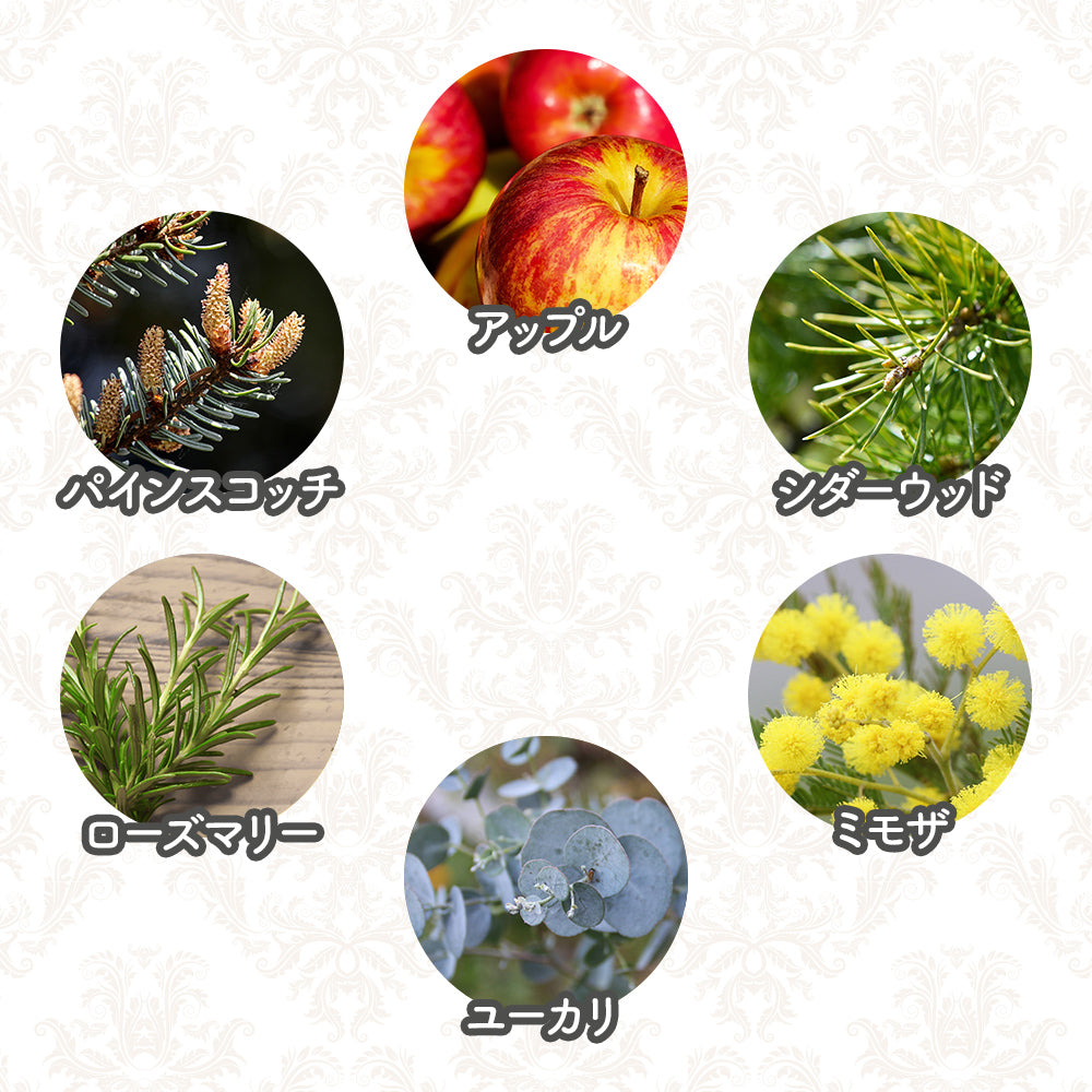アップル、ローズマリー、ミモザ、シダーウッド、ユーカリ、パインスコッチ